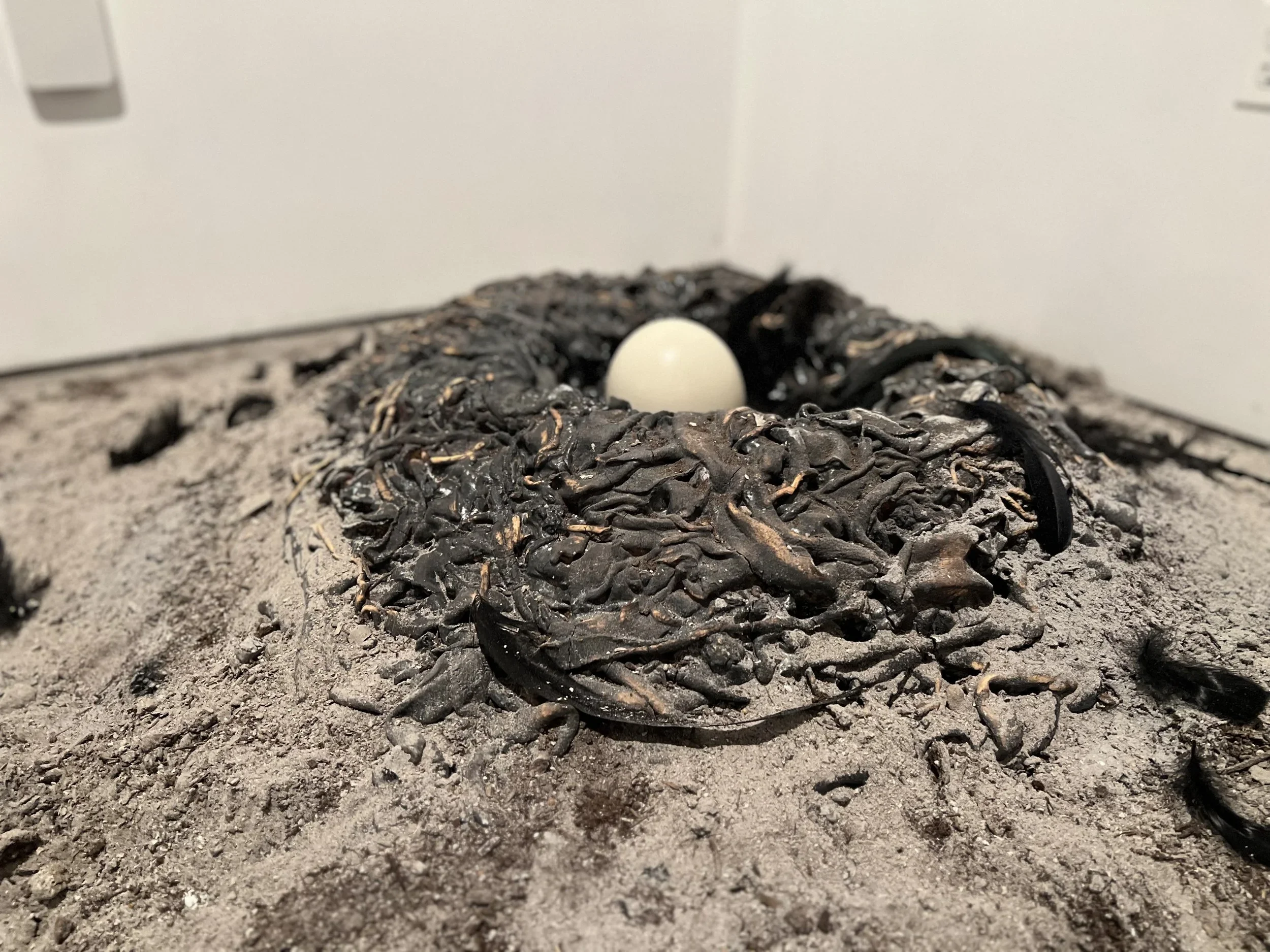 Ceramic, wood ash, feathers, ostrich egg. 2022.
