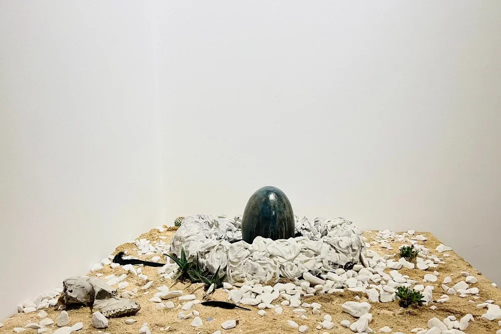 Ceramic, sand, marble chips, cacti, feathers. 2022.